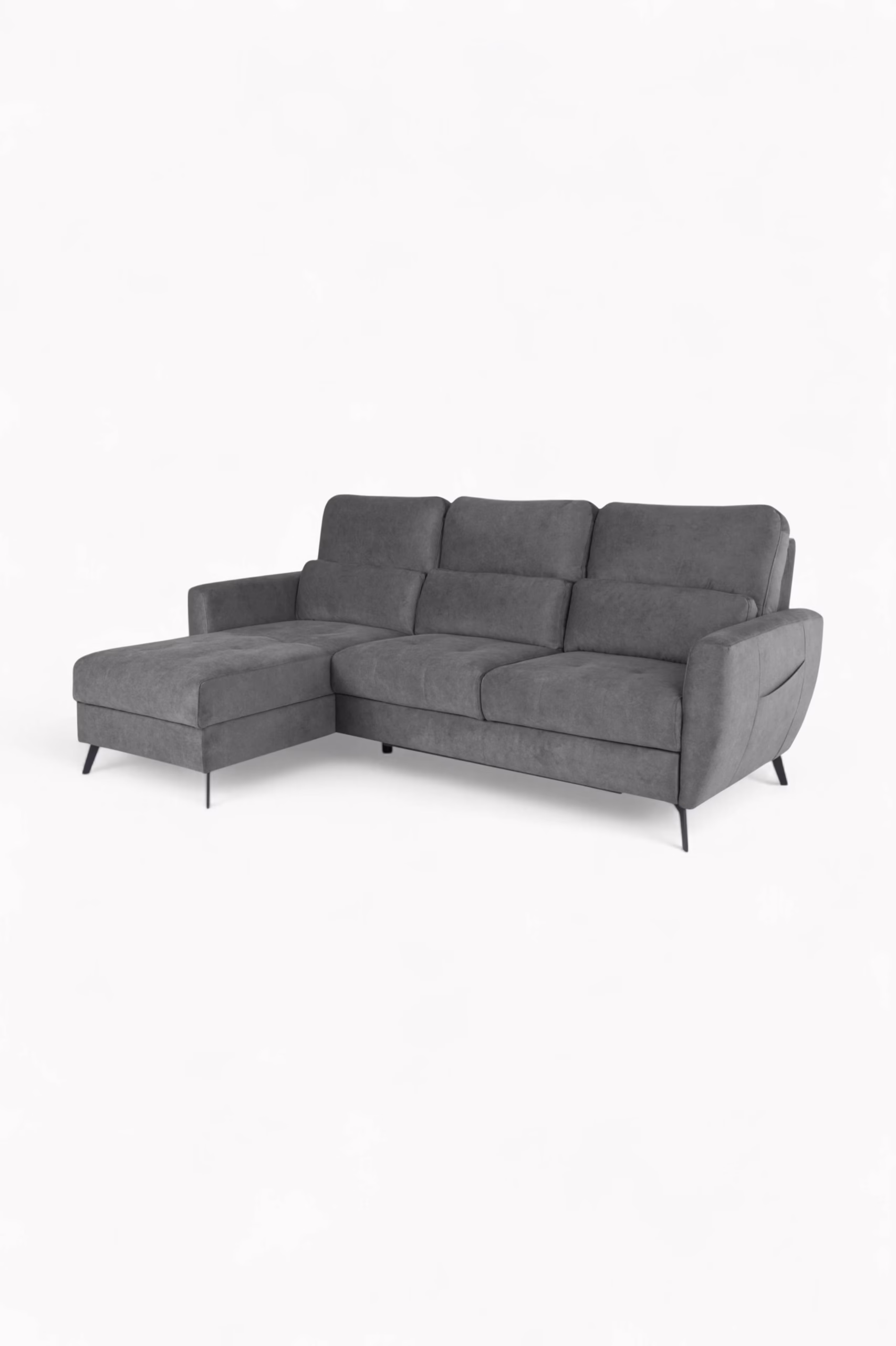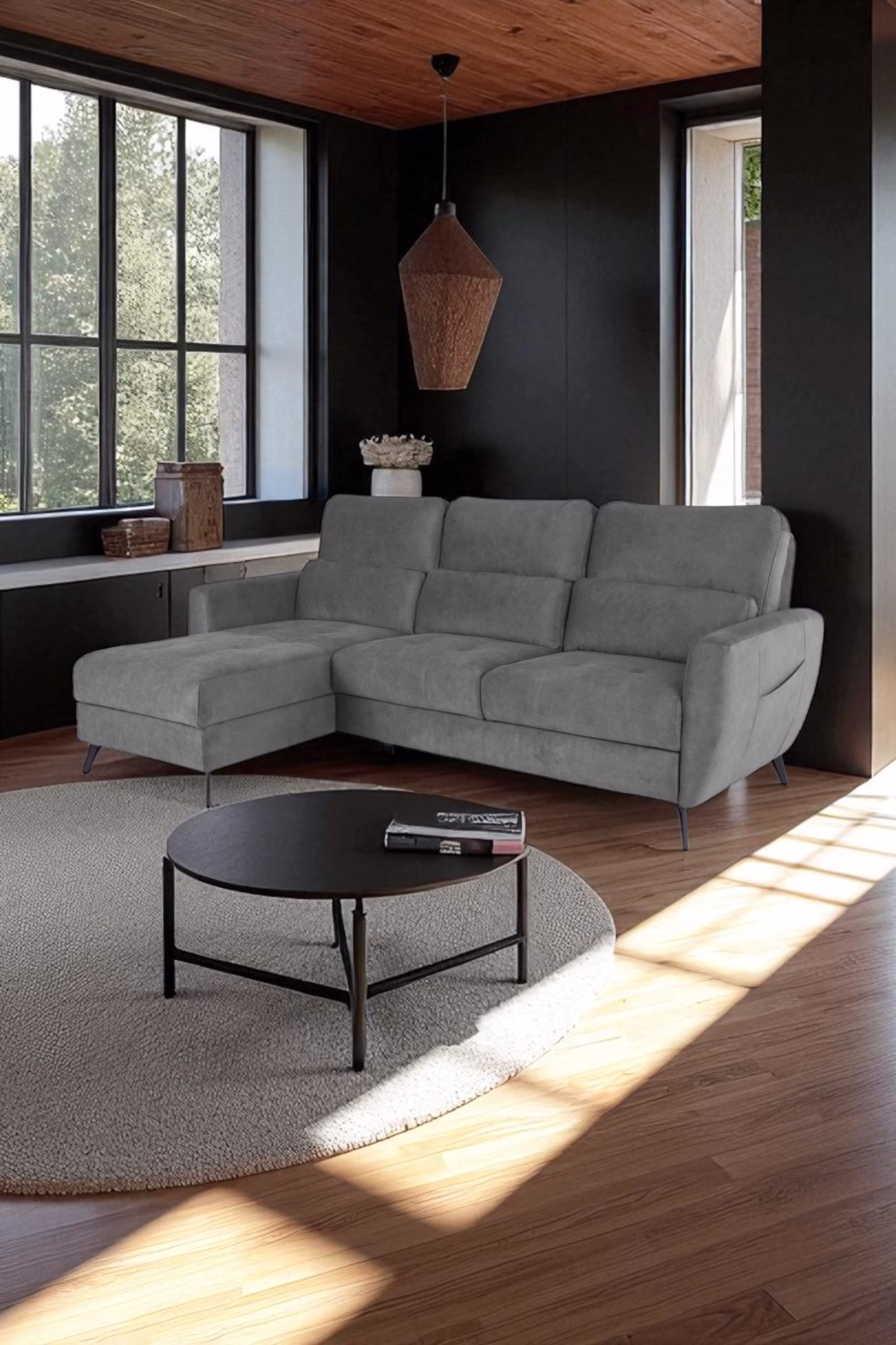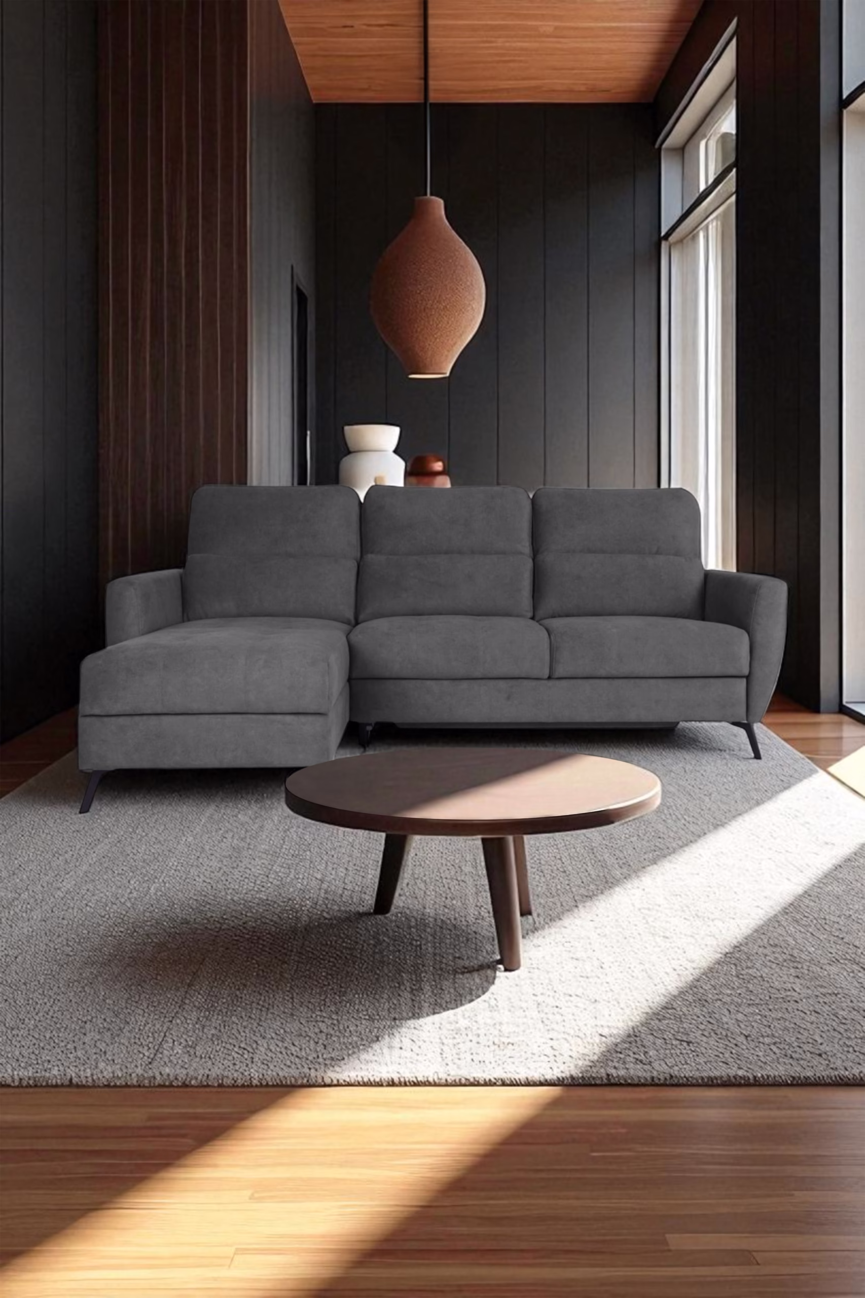 Benetto to narożnik, który łączy smukłość i elegancję z nowoczesnym designem. Wysokie metalowe nogi dodają bryle lekkości i podkreślają jej współczesny charakter, a zbalansowane proporcje sprawiają, że całość wygląda wyjątkowo harmonijnie. Profilowane oparcia z poziomym podziałem oraz miękko wykończone podłokietniki nadają narożnikowi stylu i wyraźnego charakteru. To propozycja dla osób poszukujących mebla, który łączy estetykę, komfort i funkcjonalność w jednym.