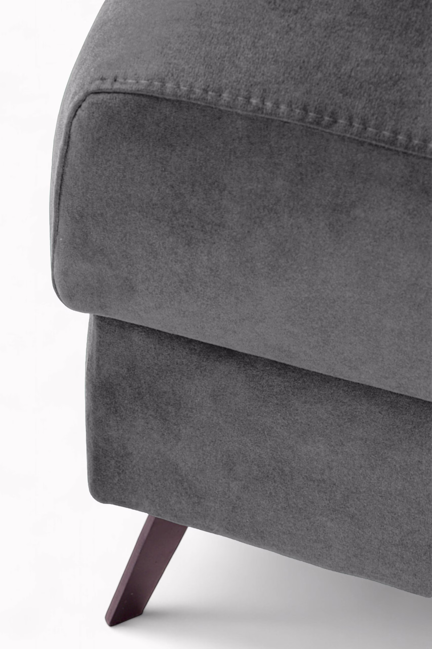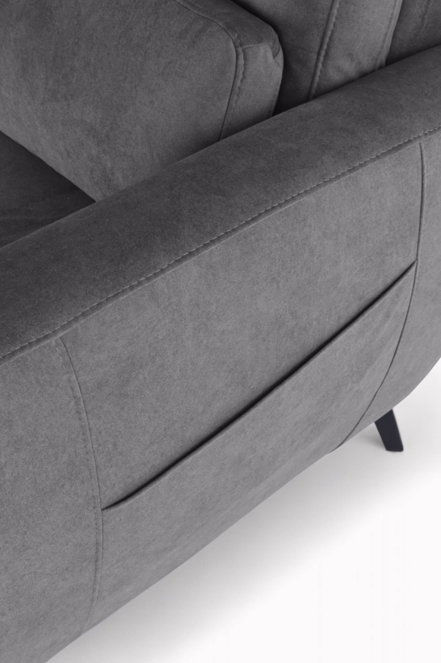 • Boczek – indywidualnie zaprojektowany podłokietnik, którego forma i proporcje nadają narożnikowi wyjątkowego charakteru i podkreślają materiał. Od strony zewnętrznej umieszczono praktyczną kieszeń, idealną na pilot, telefon czy ulubioną książkę.