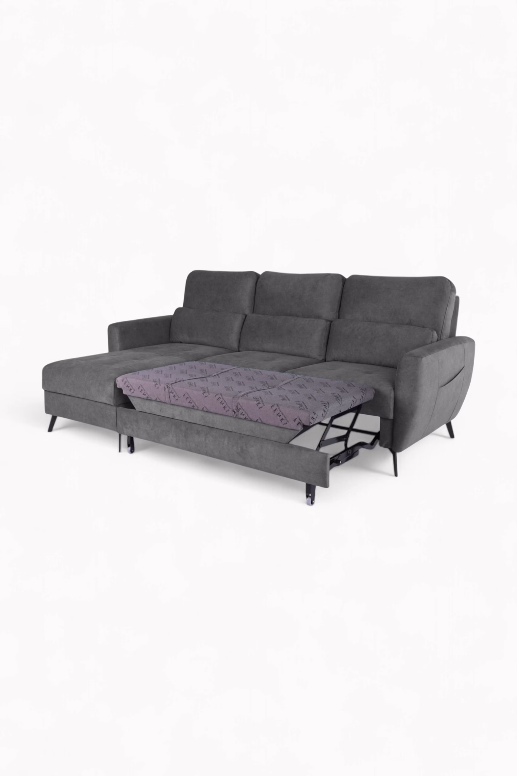 • Funkcja spania typu Delfin – w kilka sekund zmienisz sofę w wygodne łóżko. Mechanizm działa lekko i intuicyjnie, a powierzchnia spania została wykończona tkaniną z logiem producenta – gwarancja jakości i elegancji.