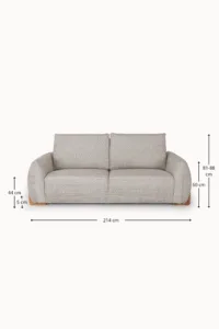 Szerokie poduchy na oparciu i głębokie siedziska zachęcają do odpoczynku, a elastyczna pianka o wysokiej gęstości gwarantuje trwały komfort na co dzień. Drewniane nóżki w ciepłym odcieniu dodają lekkości i elegancji, podkreślając naturalny charakter mebla. Obicie wykonano z tkaniny przyjaznej zwierzętom – odpornej na zaciągnięcia i łatwej w czyszczeniu, o delikatnym połysku i miękkiej, aksamitnej strukturze.