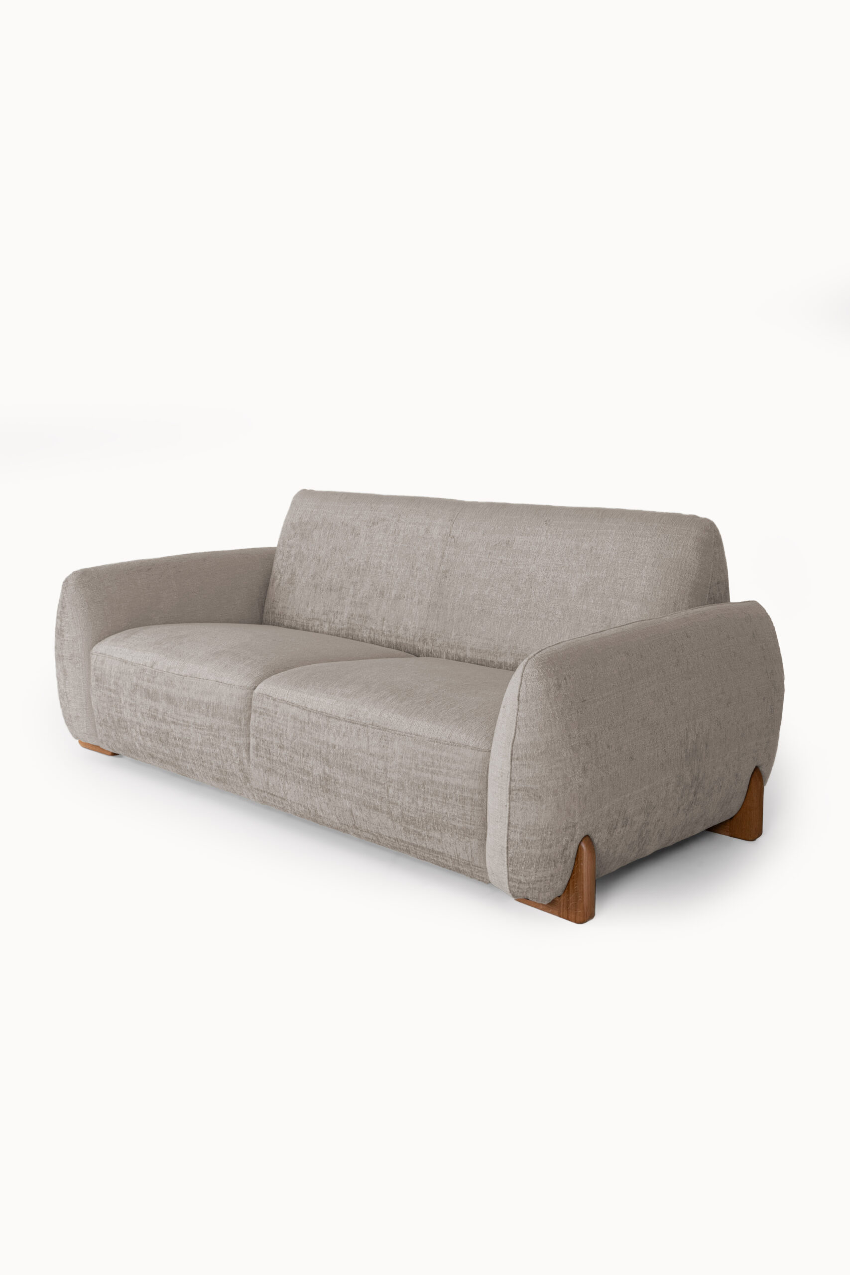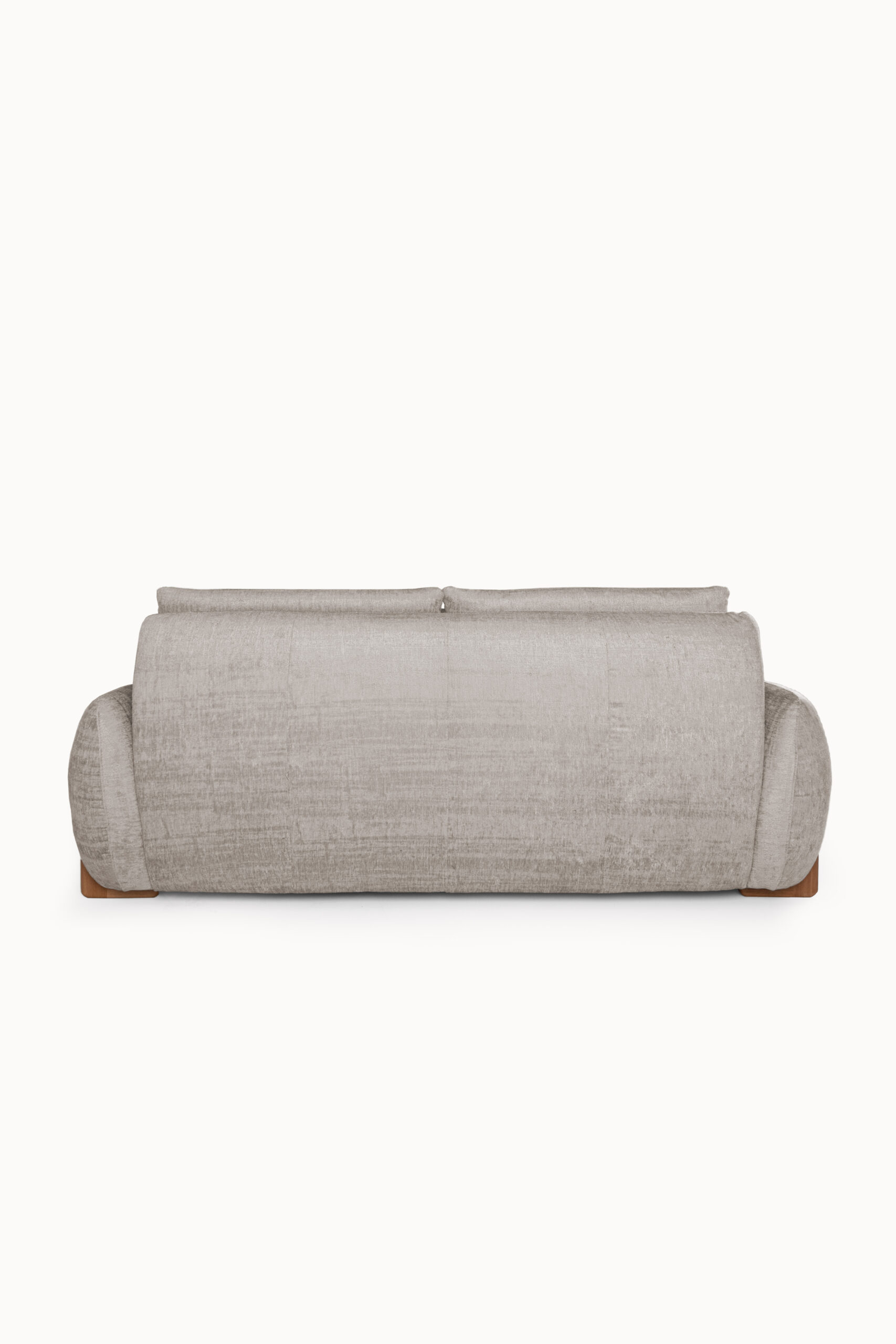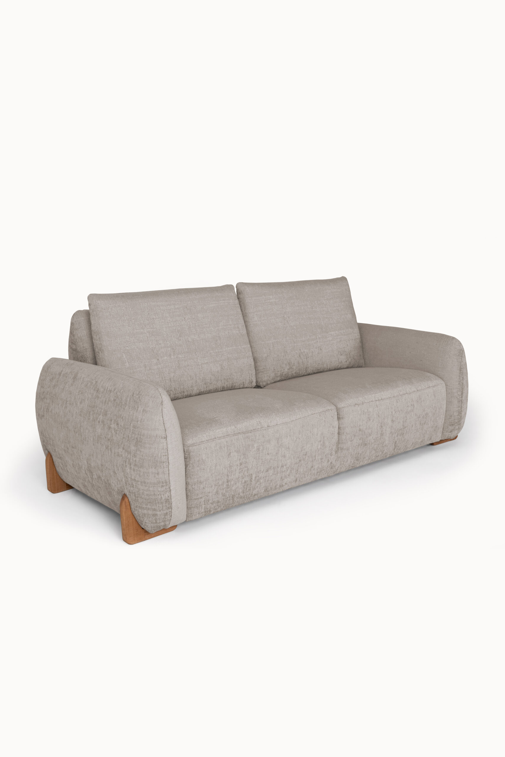 Szerokie poduchy na oparciu i głębokie siedziska zachęcają do odpoczynku, a elastyczna pianka o wysokiej gęstości gwarantuje trwały komfort na co dzień. Drewniane nóżki w ciepłym odcieniu dodają lekkości i elegancji, podkreślając naturalny charakter mebla. Obicie wykonano z tkaniny przyjaznej zwierzętom – odpornej na zaciągnięcia i łatwej w czyszczeniu, o delikatnym połysku i miękkiej, aksamitnej strukturze.